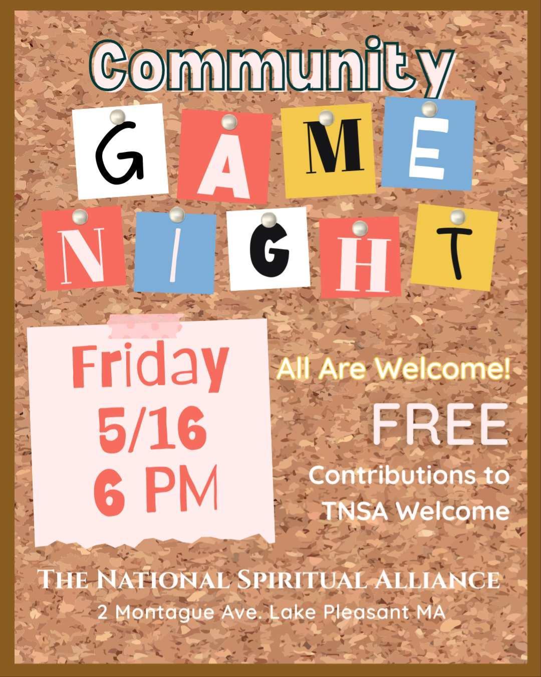 Join us for a joyful evening of games, laughter, and connection! Hosted by The National Spiritual Alliance, this event is open to the Lake Pleasant community, the TNSA family, and friends beyond. Let’s come together across generations to share in community, joy, and positive energy.