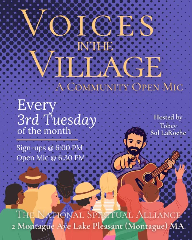 Voices in the Village is a welcoming, community-centered open mic held every third Tuesday of the month at the National Spiritual Alliance. Sign-ups begin at 6:00 PM, with the open mic starting at 6:30 PM.