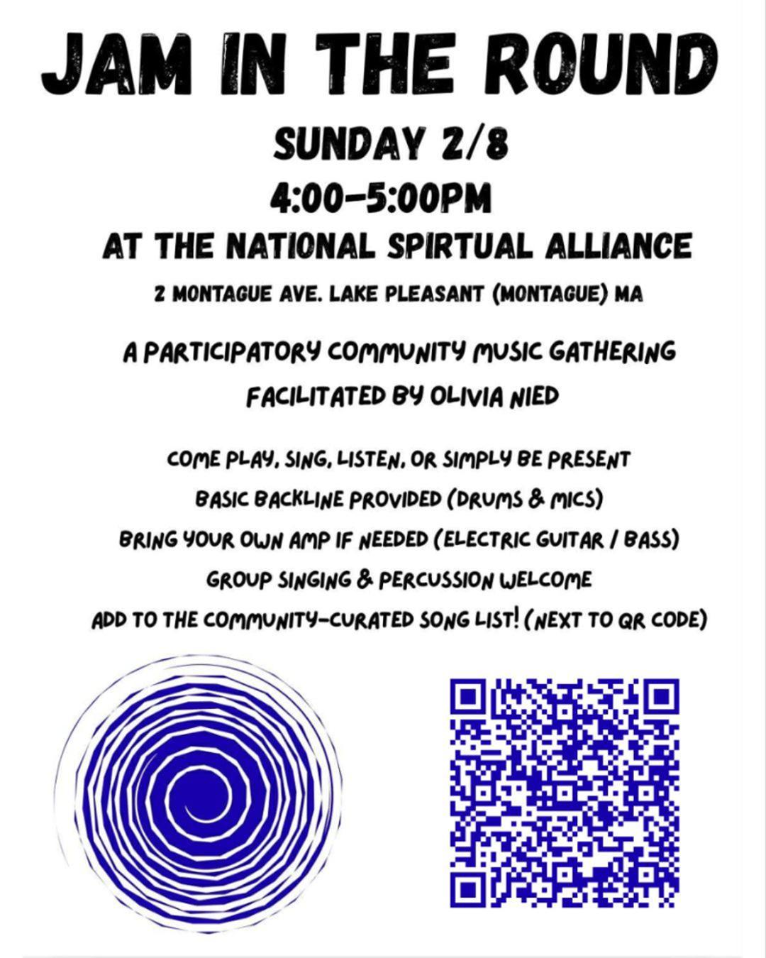 Jam in the Round is a participatory community music gathering focused on connection, shared energy, and making music together in an open and welcoming space. This is not a performance or open mic, but a chance to play, sing, listen, or simply be present as part of a collective musical experience.