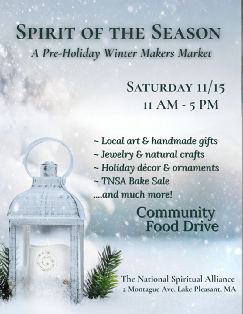 On Saturday, November 15, the National Spiritual Alliance will host Spirit of the Season: A Pre-Holiday Winter Makers Market at Thompson Temple in Lake Pleasant from 11 a.m. to 5 p.m. The event marks the beginning of the winter season with a joyful celebration of local creativity, community spirit, and giving back.