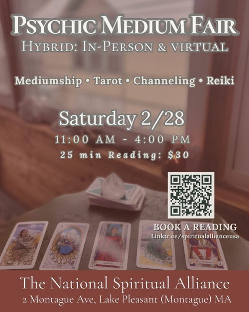 Join The National Spiritual Alliance this February 28th for a special Hybrid virtual and in-person Psychic Medium Fair, bringing together trusted intuitive practitioners for a day of insight, connection, and spiritual support—accessible from wherever you are.