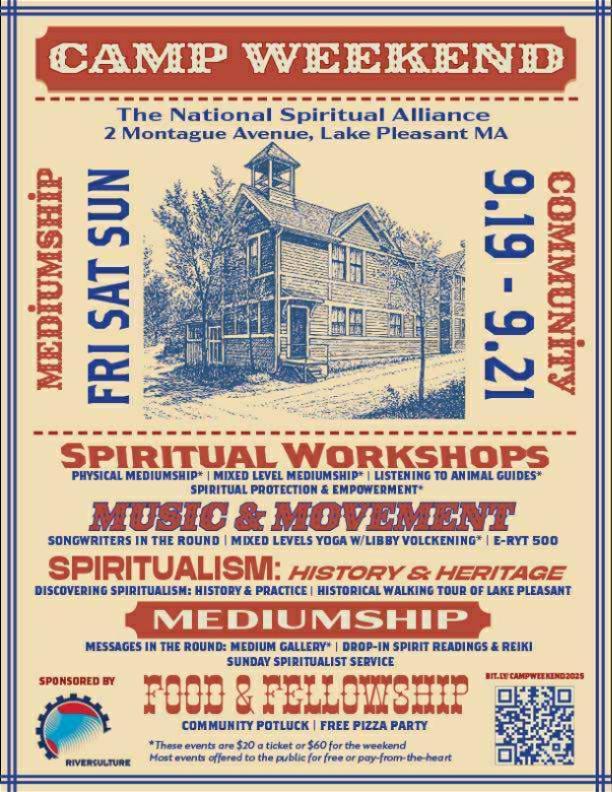 For generations, the National Spiritual Alliance has gathered in Lake Pleasant for Camp Week—a time of learning, fellowship, and connection with Spirit. This year, we honor that tradition with Camp Weekend, open to all who are curious about spiritual development, history, and community.